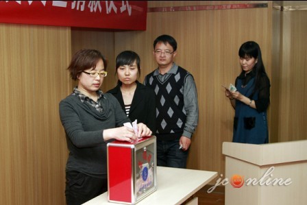 圖為員工依次上臺(tái)捐款